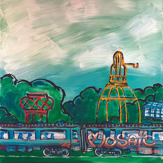 L'idée est de pouvoir réunir toutes les toiles par le lien du train. Cette répétition permet de pouvoir bouger les toiles dans le lieu, de les faire voyager, de renouveler l'espace commun. Les sujets ont été travaillé de manière frontale comme une frise.